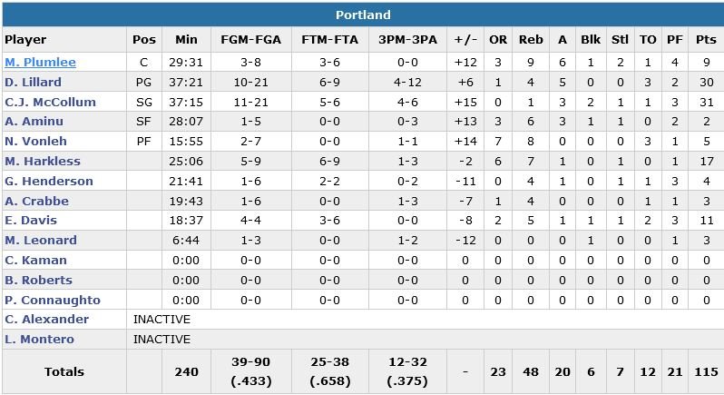 Avec 31 points (11/21, 3 rebonds et 2 contres) de C.J. McCollum (dont 2 lancers-francs à 2.7 secondes pour définitivement tuer le match) et 30 points (10/21, 4 rebonds et 5 passes) de Damian Lillard, Portland a signé une 10e victoire en 11 matchs (5e consécutive, 14 succès en 17 rencontres) cette nuit aux dépens du Jazz d’Utah, 115-111.