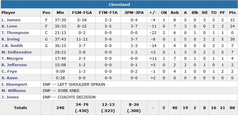 Kyrie Irving termine pourtant à 30 points à 11/21 et 5 passes, Kevin Love à 24 points à 8/15 et 7 rebonds mais LeBron James est lui limité à 12 points (soit 13 en-dessous de sa moyenne) à 5/18, 8 rebonds et 5 passes. Les Cavs s’enfoncent tout seuls en première mi-temps avec 12 ballons perdus que les Pistons convertissent en 16 points de l’autre côté du terrain. Detroit est devant 56-49 à la mi-temps. L’écart passe à 17 points dans le 3e quart-temps avant que Cleveland n’intensifie ses efforts en défense et ne prive Detroit du moindre point durant les dernières 4’56 de la période. Mais l’attaque ne suit pas et les locaux ne recollent qu’à 75-68.