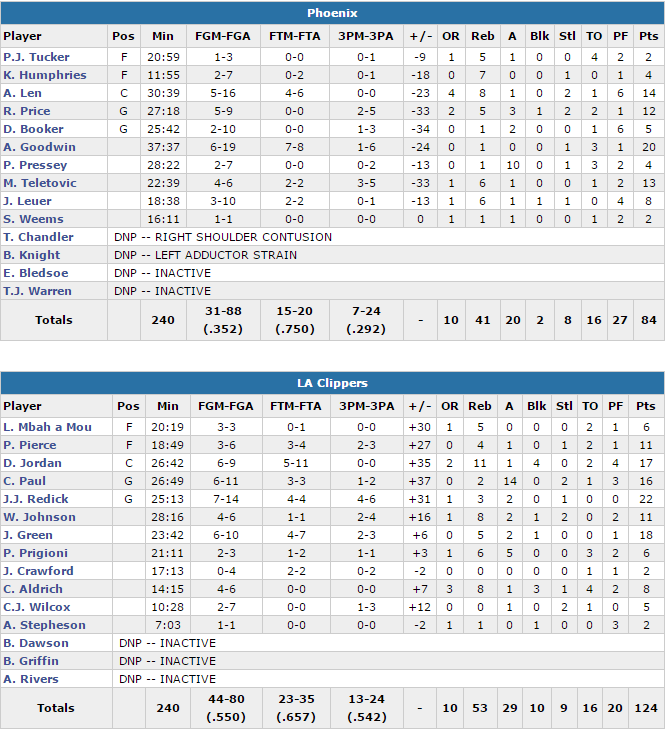 Toujours décimés, les Suns n’ont pas existé dans ce match où les locaux s’en sont donnés à cœur joie. JJ Redick termine meilleur marqueur avec 22 points à 7/14 dont 4/6 à trois points alors que Chris Paul compile 16 points et 14 passes et DeAndre Jordan ajoute 17 points et 11 rebonds. Jeff Green en a profité pour trouver un peu ses marques avec 18 points à 6/10 en sortie de banc. Les Californiens ont shooté à 55% dont un superbe 13/24 derrière l’arc. Ils ont limité les Suns à seulement 35.2% dont un 7/24 à trois points. Archie Goodwin est le meilleur scoreur avec 20 points mais à 6/19. Alex Len ajoute 14 points mais à 5/16 et Mirza Teletovic 13 unités à 4/6.