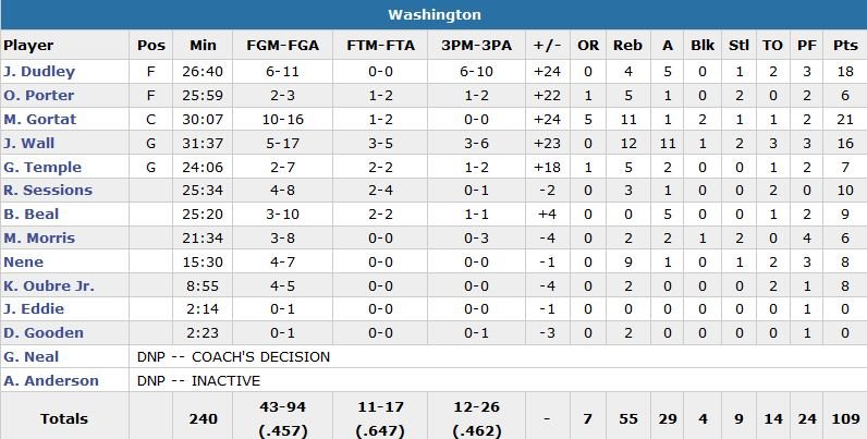 Devant de 3 points 54-51, les Wizards démarrent leur 3e quart-temps sur un 14-0 avec un Dudley à 3-points, puis à la passe pour le layup de Gortat et encore derrière la ligne. Quelques minutes plus tard, il rate ue nouvelle tentative au grand dam du public mais Otto Porter prend le rebond et sert Wall, qui met lui dedans derrière la ligne, 68-81.