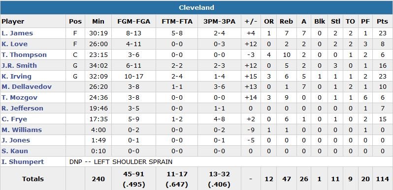Limité à 12 points à 5/18 (0/4 à 3-points et 6 ballons perdus) contre les Pistons lundi, LeBron James a cette fois pu se reposer dans le 4e quart-temps. Irving n’avait lui joué que 9 minutes dans cette défaite après avoir été piqué par des punaises de lit à Oklahoma City. Cleveland a fait la différence cette nuit dans un 2e quart-temps à 40 points pour prendre une avance confortable à la mi-temps, 63-52. L’écart atteindra les 24 points dans le 4e quart-temps. Channing Frye, acquis via un trade la semaine dernière, rentre 4 trois-points et termine à 15 points, J.R. Smith signe lui 16 points à 6/11 et 5 rebonds.