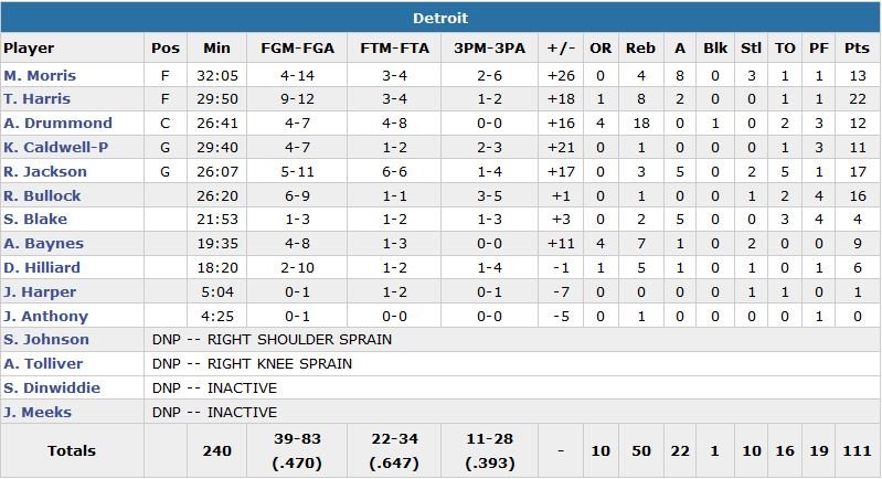 Les Pistons prennent 16 points d’avance dès le 1er quart-temps et ne seront jamais menacés dans cette rencontr. Hollis Thompson inscrit 19 points pour les 76ers, qui perdent un 6e match consécutif. Jahlil Okafor ne termine qu’à 13 points et 2 rebonds et aucun autre joueur de Philadelphie ne dépasse les 8 points. Sans Anthony Tolliver (genou) et Stanley Johnson (épaule), Detroit a pu compter sur Reggie Bullock (16 points) en sortie de banc malgré son nez cassé.