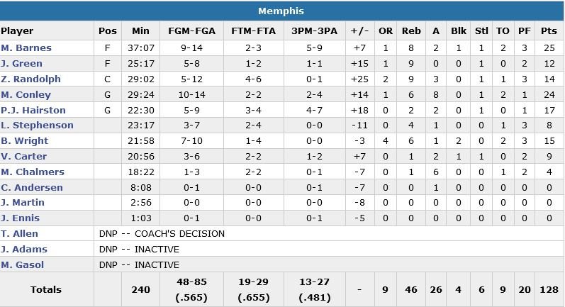 Memphis prend rapidement 15 points d’avance en rentrant 7 de ses 10 premiers shoots, dont 3 trois-points. Bryant rentre son premier tir – un 3-points – mais manque ses 3 tentatives suivantes. Avec l’aide du banc les Lakers reviennent à 61-58 dans le 2e quart-temps mais Memphis recreuse l’écart et mène 67-58 à la pause derrière 18 points de Barnes et 12 de Conley. Los Angeles reviendra à 9 points maximum (2 fois) dans le 4e quart-temps