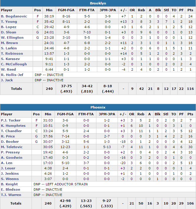 Malgré 30 points, Mirza Teletovic n’a rien pu faire pour éviter ce nouveau revers des siens, le 13ème consécutif, ce qui égale le record de franchise. En face les Nets ont pu compter sur une marque très équilibrée avec 7 joueurs à au moins 10 points dont 18 pour Thaddeus Young, 16 pour Markel Brown et 12 pour Brook Lopez. Ils ont shooté à 49.3% contre seulement 42.9 aux Suns. Ronnie Price inscrit 16 points et Alex Len 13.