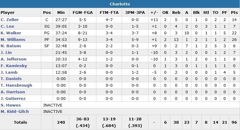 22 points (8/21, 3 rebonds et 10 passes) dont le layup de la gagne à 2.4 secondes du buzzer pour Kemba Walker (9 points dans les 5 dernières minutes) cette nuit au Bankers Life Fieldhouse d’Indianapolis, témoin de la victoire 96-95 des Hornets.
