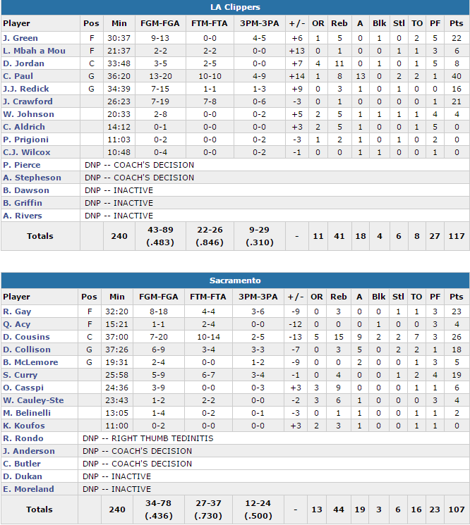 En plus Chris Paul a apporté sa défense et il a contribué à une série de 20-0 dans le troisième qui a tué le match. Il a été très bien aidé par Jeff Green (22 points à 9/13), JJ Redick (16 points à 7/15) et Jamal Crawford (21 points à 7/19). Avec 48.3% aux tirs et seulement 8 ballons perdus, les hommes de Doc Rivers se sont mis dans les meilleures dispositions, surtout qu’ils ont réussi à contenir DeMarcus Cousins. Si le pivot compile 26 points, 15 rebonds et 9 passes, il shoote à seulement 7/20. Sacramento rentre seulement 43.6% de ses shoots malgré un 12/24 et perd surtout 16 ballons. Rudy Gay ajoute 23 points à 8/18, Darren Collison 18 à 6/9 (il était titulaire à la place de Rajon Rondo, blessé) et Seth Curry 19 à 3/4 à trois points.