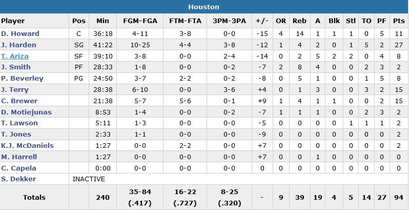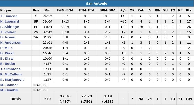 Malgré un 8e match consécutif à l’extérieur, les Spurs n’ont montré aucun signe de fatigue particulier et n’ont jamais été menés au score dans cette rencontre, menant de plus ou moins 10 points tout au long de la rencontre. En fait, l’écart va même monter à 31 points en seconde mi-temps avant que Houston ne revienne doucement au score par James Harden (27 points à 10/25 et 4 rebonds) et Jason Terry (15 points à 6/10) à 3-points durant un 6-2 qui va permettre aux Rockets de recoller à 94-83 à moins de 4 minutes de la fin. San Antonio ralentit ensuite ses adversaires en faisant faute intentionnelle sur Dwight Howard (11 points à 4/11 et 14 rebonds) et Leonard puis Aldridge vont chacun ajouter un panier pour sécuriser la victoire.
