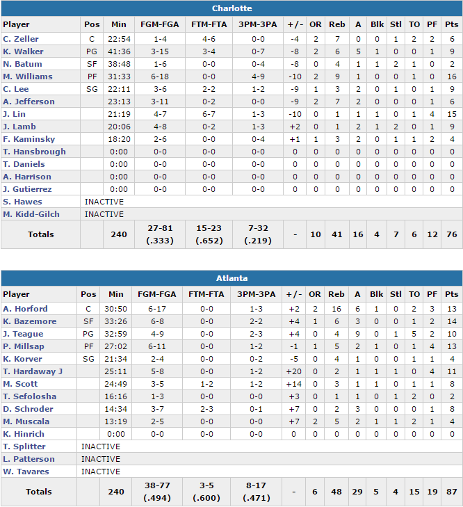 Atlanta a très vite fait l’écart avec une avance de 24 points dans le second quart mais les Hornets ont fini par revenir à 2 points en dernier acte. Les locaux ont su accélérer pour plier le match dans le sillage d’Al Horford (13 points et 16 rebonds). 5 Hawks marquent au moins 10 points dont 14 pour Kent Bazemore, 13 pour Paul Millsap, 11 pour Tim Hardaway Jr et 10 pour Jeff Teague. Ils ont shooté à 49.4% et ont fait la différence avec leur défense, bien aidée par l’extrême maladresse des Hornets, limités à 33.3% dont un 7/31 à l’extérieur, à l’image du 1/6 de Nicolas Batum et du 3/15 de Kamba Walker ou encore du 3/11 d’Al Jefferson. Marvin Williams est le meilleur marqueur avec 16 points alors que Jeremy Lin en ajoute 15.