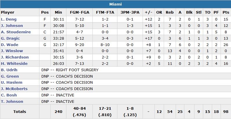 Hassan Whiteside ajoute 16 points et 11 rebonds pour le Heat, qui égale un record de franchise avec une 5e victoire consécutive à New York. Luol Deng inscrit de son côté 15 points. Carmelo Anthony termine meilleur marqueur des Knicks (14e défaite en 17 rencontres) avec 25 points à 9/24, 7 rebonds et 4 passes. Robin Lopez est en double-double avec 14 points et 14 rebonds alors que Kristaps Porzingis n’était pas vraiment réglé : 9 points à 4/13, 8 rebonds et 4 contres.