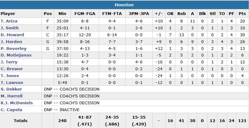 Les Bucks vont ainsi presque gâcher une avance de 13 points après avoir encaissé un 9-0 de la part des Rockets (ils s’étaient déjà fait rattrapés après avoir mené de 15 points dans le 2e quart-temps). Les alley oops, dunks et 3-points ont plu tandis que la défense n’était pas franchement à l’honneur dans ce match. Dwight Howard signe 30 points et 13 rebonds pour Houston (15/35 à 3-points), accompagné des 20 points et 11 passes de Trevor Ariza et des 28 points à 8/16, 6 rebonds et 9 passes de James Harden.