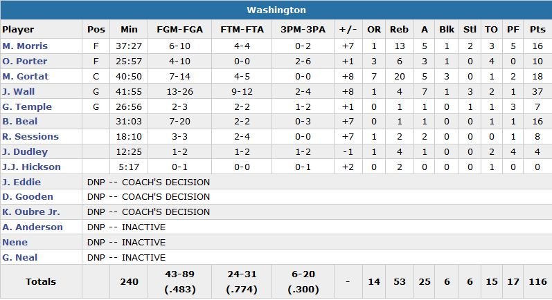 John Wall a marqué 16 de ses 37 points (13/26, 4 rebonds et 7 passes) dans le 4e quart-temps et Marcin Gortat (18 points) a battu son record de rebonds en carrière (20) pour permettre aux Wizards de venir à bout des 76ers cette nuit, 116-108.