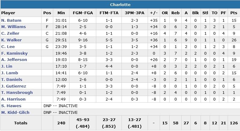 Nicolas Batum et Jeremy Lamb ajoutent 15 points et les Hornets comptent désormais 20 victoires pour 9 défaites à domicile, le 3e meilleur bilan de la Conférence Est derrière Cleveland et Toronto. Les Suns, menés par un Alex Len à 18 points et 12 rebonds, encaissent eux une 16e défaite consécutive à l’extérieur. Charlotte (13/27 à 3-points) compte déjà 26 points d’avance à la mi-temps (68-41) et mène 115-72 sur un 3-points de Troy Daniels à 7’56 de la fin du 4e quart-temps. Phoenix ne mènera qu’une fois dans le match, à 4-0. Ce à quoi les Hornets répondent par un 21-2 en tenant leurs adversaires à 0 panier pendant plus de 6 minutes.