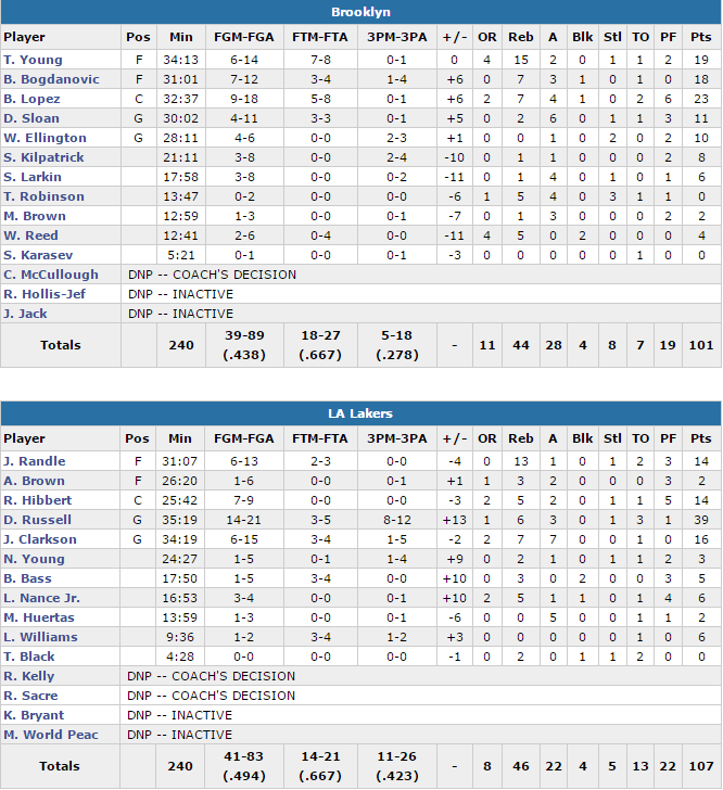 Russell signe 39 points à 14/21 dont un 8/12 derrière l’arc et pas moins de 16 points dans le dernier acte ! Il a compensé l’absence de Kobe Bryant, bien aidé par Jordan Clarkson (16 points à 6/15, 7 rebonds et 7 passes) et les intérieurs Julius Randle (14 points à 6/13 et 13 rebonds) – Roy Hibbert (14 points à 7/9). Dans son sillage les Lakers ont shooté à 49.4% dont un 11/26 derrière l’arc, bien mieux que les Nets, limités à 43.8% et 5/18 à trois points par la bonne prestation défensive des Californiens. Les 5 titulaires ont atteint les 10 points avec 23 points pour Brook Lopez, 19 pour Thaddeurs Young 15 rebonds) et 18 pour Bojan Bogdanovic.