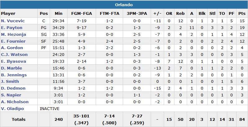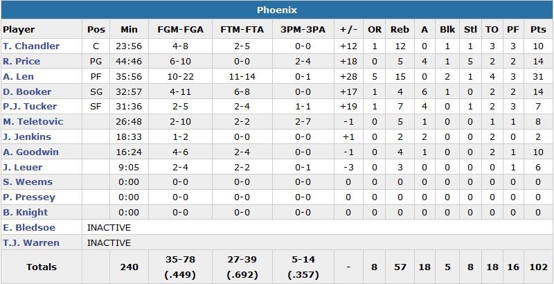 Les Suns marquent les 9 premiers points de la 2nde mi-temps et Scott Skiles décide d’entièrement changer son 5, ce qui n’a pas aidé. Phoenix ajoute 7 points de plus avant qu’enfin, Payton n’inscrive un panier pour le Magic à 5’24 de la fin du 3e quart, mettant fin à un 0/14 consécutif d’Orlando. Mais à ce moment-là les visiteurs ont déjà pris 24 points de retard et Orlando ne recollera pas à moins de 13 points. À noter que l’ancien record de points de Len (8.4 points de moyenne) était de 23 points. Victor Oladipo n’a pas joué (dos).