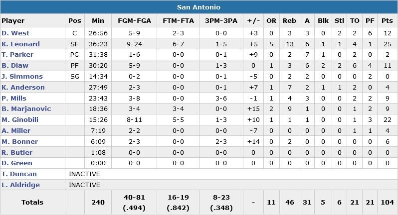 Le tout en l’absence de 3 titulaires : LaMarcus Aldridge (migraine), Tim Duncan (repos) et Danny Green (repos). DeMarcus Cousins est le seul joueur des Kings à se démarquer hormis Quincy Acy et ses 16 points à 7/7 avec 31 points à 10/20, 9 rebonds et 3 passes dans cette 5e défaite en 6 matchs pour Sacramento. À 38 ans, El Manu s’est tranquillement baladé dans la raquette avec notamment un layup à gauche après avoir drivé entre Willie Cauley-Stein et Omri Casspi dans le 3e quart-temps.