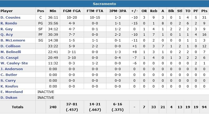 Profitant de l’absence de Duncan et Aldridge, Rondo et Cousins ont plus de facilité à mettre en place leur pick-and-roll en début de match. Quincy Acy en bénéficie également avec 14 points à 6/6 en 1ère mi-temps. Menés de seulement 3 points (57-54) à la mi-temps, les Kings vont vite constater que la fête est terminée en début de seconde mi-temps, où ils mettront 5 minutes et demi à marquer leurs premiers points (0/7 et 3 ballons perdus avant un shoot réussi de Casspi à 6’47 de la fin du 3e quart-temps).