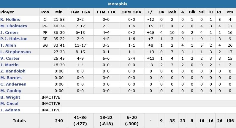 À 25 secondes restantes, Mario Chalmers rentre un layup et Memphis repasse devant 101-100. Allen gagne ensuite un entre-deux face à James à 17 secondes. Chalmers rentre un lancer, Carter 2 mais James rentre un 3-points pour ramener les Cavaliers à 104-103. Carter ajoute 2 points sur la ligne et Memphis s’en sort malgré une ultime tentative d’Irving à 3-points, qui rebondit sur le fond du cercle à la sonnerie.