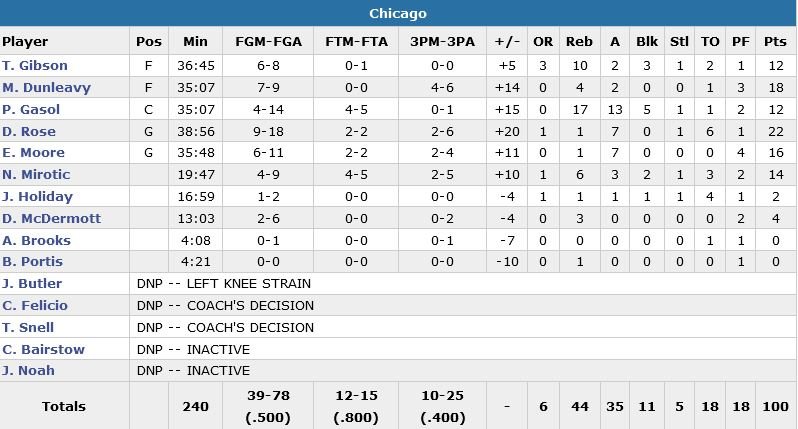 L’Espagnol compile 12 points à 4/14, 17 rebonds, 13 passes et 5 contres en 35 minutes de jeu. Taj Gibson est lui en double-double avec 12 points et 10 rebonds. Jerryd Bayless signe 20 points pour les Bucks, qui perdent un 3e match en 4 rencontres. Jabari Parker et Khris Middleton terminent à 18 points chacun alors que Giannis Antetokounmpo est complet mais limité avec 12 points, 10 passes et 5 rebonds. Greg Monroe (11 points à 5/14 et 14 rebonds) a ramené les siens à 2 points à 4’53 sur un hook shot mais Chicago a répondu par un 8-1. Moore et Dunleavy rentrent chacun un 3-points avant 2 lancers de Gasol à 1’49, 93-84. Ce dernier ajoute un layup et Rose 2 lancers à 27 secondes pour sécuriser la victoire des locaux, la 2e en 3 matchs contre les Bucks cette saison.
