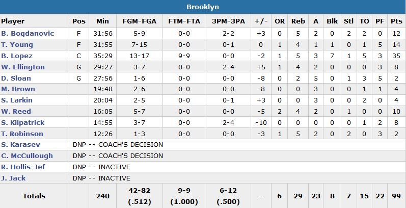 Brook Lopez passe lui à un point de son record en saison (35 points à 13/17, 5 rebonds, 3 passes et 7 contres) mais Brooklyn perd tous ses matchs de la saison contre Toronto pour la 1ère fois depuis 2009-10. Thaddeus Young (14 points à 7/15 et 4 rebonds)signe 10 points dans le 1er quart-temps (remporté 28-23 par les visiteurs) et les Nets prennent rapidement l’avantage. Le banc de Brooklyn va inscrire 20 points dans le 2e quart-temps, tenant en plus ses adversaires à 20% sur la période (3/15).