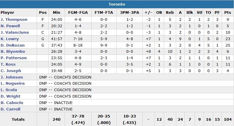 Les Raptors ont remonté un déficit de 16 points (58-42) à la mi-temps. Ils sont revenus grâce à un 22-9 dans les dernières 5’55 du 3e quart-temps pour finalement prendre la tête sur un 3-points de Patrick Patterson en ouverture de 4e quart-temps. Trois 3-points de Terrence Ross (11 points et 6 rebonds) et Lowry transformeront au final un déficit de 2 points en avantage de 10 et en seulement 3 minutes. Les Nets reviendront à 3 points à plusieurs occasions sans jamais réussir à faire mieux.