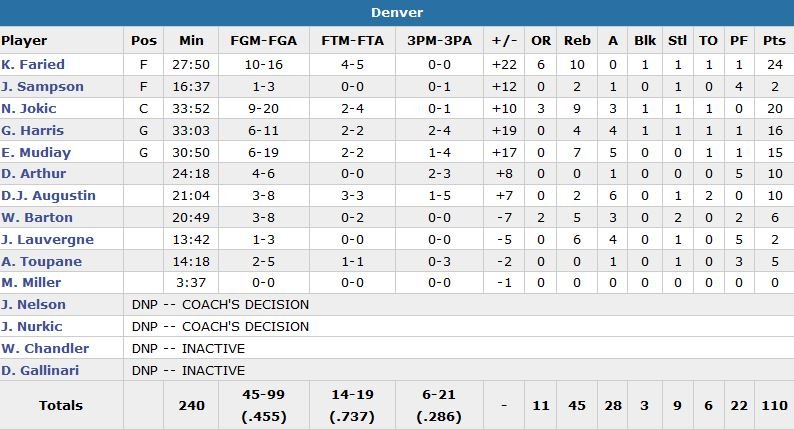 À noter : Axel Toupane a inscrit ses premiers points NBA sur un dunk dans le 3e quart-temps ! Il termine à 5 points à 2/5 et 1 passe, dont un 2+1 important dans le 4e quart-temps. Joffrey Lauvergne joue lui 13 minutes pour 2 points à 1/3, 6 rebonds et 4 passes.
