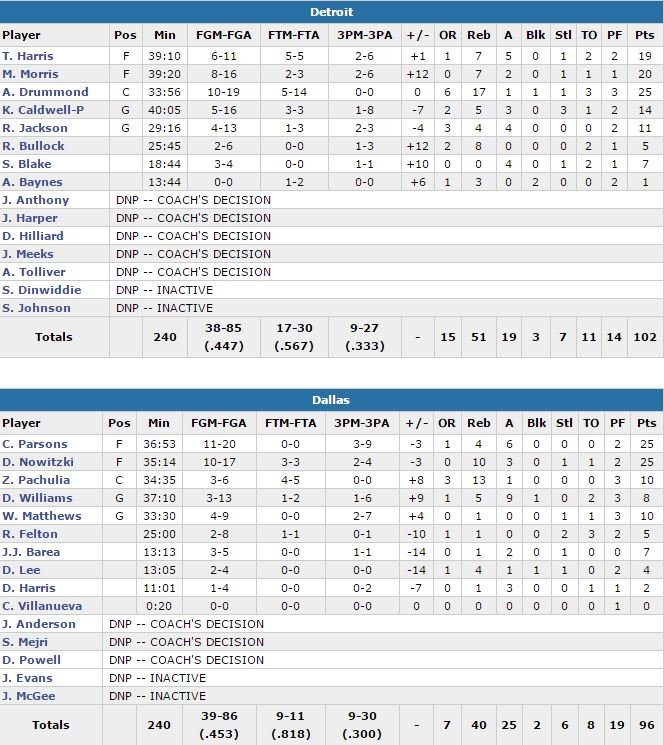 Les Pistons de Marcus Morris (20 points à 8/16 et 7 rebonds) et Andre Drummond (25 points à 10/19 et 17 rebonds) ont fait la différence durant un run décisif dans le 4e quart-temps pour battre les Mavericks chez eux cette nuit, 102-96.
