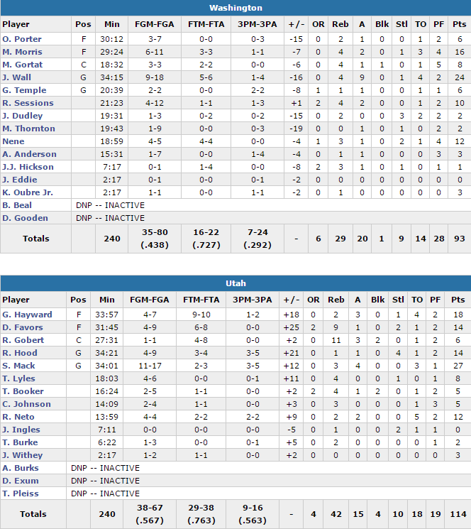 Mack a été bien aidé par les 18 points de Gordon Hayward et les 14 points de Derrick Favors et Rodney Hood. Rudy Gobert a fait le boulot en défense avec 6 points, 11 rebonds, passes et 2 contres. Le Jazz a fait un match plein des deux côtés du terrain avec 56.7% aux tirs dont un 9/13 derrière l’arc tout en limitant Washington à 43.8%. Seul point noir les 18 ballons perdus. John Wall signe 24 points et 9 passes tandis que Markieff Morris en ajoute 16. Bradley Beal était lui une nouvelle fois absent, touché au pelvis.