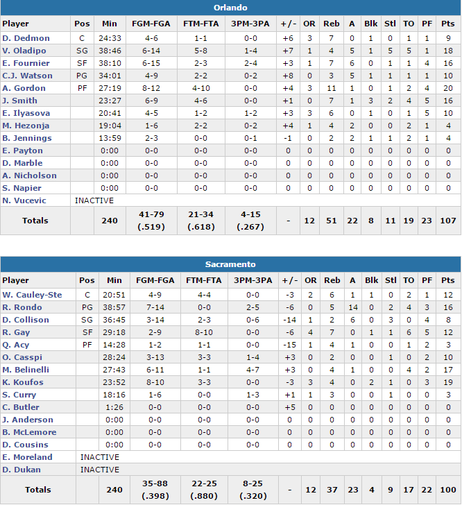 Le Magic a fait parler son collectif avec 6 joueurs à au moins 10 points dont 20 pour Aaron Gordon (11 rebonds), 18 pour Victor Oladipo (5 interceptions) et 16 pour Evan Fournier (7 rebonds et 6 passes) et Jason Smith. L’équipe a shooté à 51.9% malgré un petit 4/15 derrière l’arc et capté 51 rebonds, la faute à la maladresse californienne, Sacramento étant limité à 39.8%. Kosta Koufos est le meilleur marqueur des Kings avec 19 points tandis que Marco Belinelli en ajoute 17 et Rajon Rondo compile 16 oints et 14 passes. Darren Collison et Rudy Gay n’ont pas réussi à élever leur niveau comme attendu et ils combinent un horrible 5/23 aux tirs.
