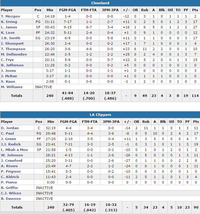 Les Cavs ont construit leur succès sur leur défense et leur adresse extérieure avec un 18/37 derrière l’arc. Le trio LeBron James (27 points à 9/15 dont 3/4 à trois points), Kyrie Irving (17 points à 7/17) et Jr Smith (17 points à 5/8 à trois points) s’en est donné à cœur joie, bien aidé par les 15 points à 5/7 à trois points de Channing Frye et les 12 de Kevin Love (9 rebonds). Tristan Thompson signe lui 10 points et 11 passes. En face les Clippers ont été en difficulté en attaque avec seulement 40.5 % aux shoots. JJ Redick signe 19 points à 7/11, Chris Paul 17 points à 5/11 et 10 passes mais derrière personne n’a réussi à élever son niveau.