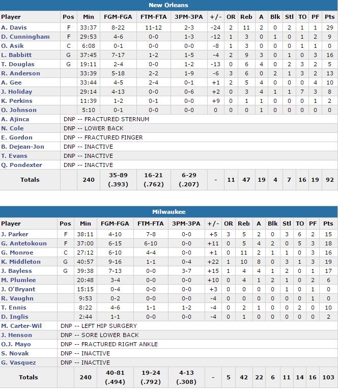 Exemple le plus flagrant : Ryan Anderson, qui termine à 1/9 derrière la ligne, lui qui avait rentré 6 tirs à 3-points en janvier. En face l’équipe de Jason Kidd (qui met fin à une série de 6 défaites consécutives remontant à 2012 contre les Pelicans) s’était préparée à mieux défendre sur les shooteurs et a parfaitement fait tourner en attaque, avec 6 joueurs à minimum 10 points, dont Giannis Antetokounmpo (18 points à 6/15, 5 rebonds et 4 passes), Jerryd Bayless (17 points à 7/13, 4 rebonds et 4 passes) et un Khris Middleton qui frôle le triple-double (19 points à 9/16, 10 rebonds et 8 passes). Anthony Davis termine lui à 29 points (8/22) et 11 rebonds mais son équipe s’incline pour la 7e fois en 8 rencontres.