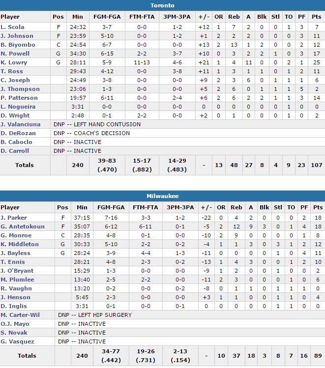 En l’absence de DeMar DeRozan, mis au repos, Kyle Lowry a porté l’équipe sur ses épaules avec 25 points et 11 passes alors que le rookie Norman Powell signe 17 points. Jonas Valanciunas était lui blessé mais Bismack Biyombo a fait le job avec 12 points et 13 rebonds, notamment en troisième quart où il a été important dans le quart décisif, permettant de limiter Milwaukee à 6/22 aux tirs. Toronto s’est appuyé sur sa défense (44.2% pur Milwaukee) et une superbe adresse à trois points avec un 14/29 contre 2/13 à Milwaukee. Giannis Antetokounmpo passe à une passe décisive du triple-double puisqu’il compile 18 points, 12 rebonds et 5 passes alors que Jabari Parker marque 18 points.