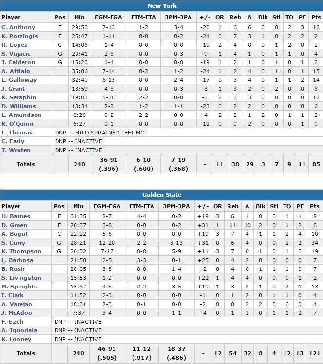 Une nouvelle fois Stephen Curry (qui n’a même pas eu à jouer le 4ème quart-temps) a sorti un gros match avec 34 points à 12/20 dont 8/13 derrière l’arc et 4 passes en 28 minutes. Trois autres Warriors atteignent ou dépassent la barre des 10 points : Klay Thompson (19 points à 7/17 et 7 rebonds), Marreese Speights (13 points à 3/5 à 3-points) et Andrew Bogut (10 points à 5/6, 7 rebonds et 4 passes) le cinq majeur des Warriors a dominé celui des Knicks 77 points à 28… Draymond Green, qui avait signé un triple-double à New York le 31 janvier, termine à 6 points, 11 rebonds et 10 passes.