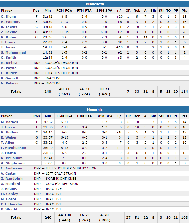 Minnesota a démarré fort en rentrant 67% de ses tirs dont 14 points pour LaVine dont 4 3pts et un avantage au score 42-25. Sans Marc Gasol, Mike Conley et Zach Randolph, les Grizzlies ont compté jusqu’à 20 points de retard en 3ème quart, mais ils ont réussi à revenir dans la rencontre. Ils sont revenus à 4 points avec moins de deux minutes à jouer mais Towns a inscrit 4 points de suite pour plier l’affaire.
