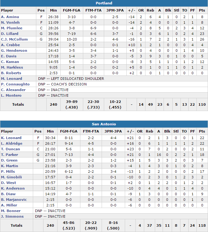 Pendant une mi-temps Portland s’est accroché avant d’exploser en 3ème acte sous les assauts de LaMarcus Aldridge (22 points à 9/14 en 26 minutes), Tony Parker (18 points et 16 passes, soit à une passe de son record, en 27 minutes), Kawhi Leonard (22 points à 8/11, dont 4/4 à trois points) et Patty Mills (17 points à 6/12. San Antonio a shooté à 52.3% et limité Portland à 43.8%. Damian Lillard (23 points à 7/19) et CJ McCollum (26 points à 10/20) n’ont pu porter leur équipe.