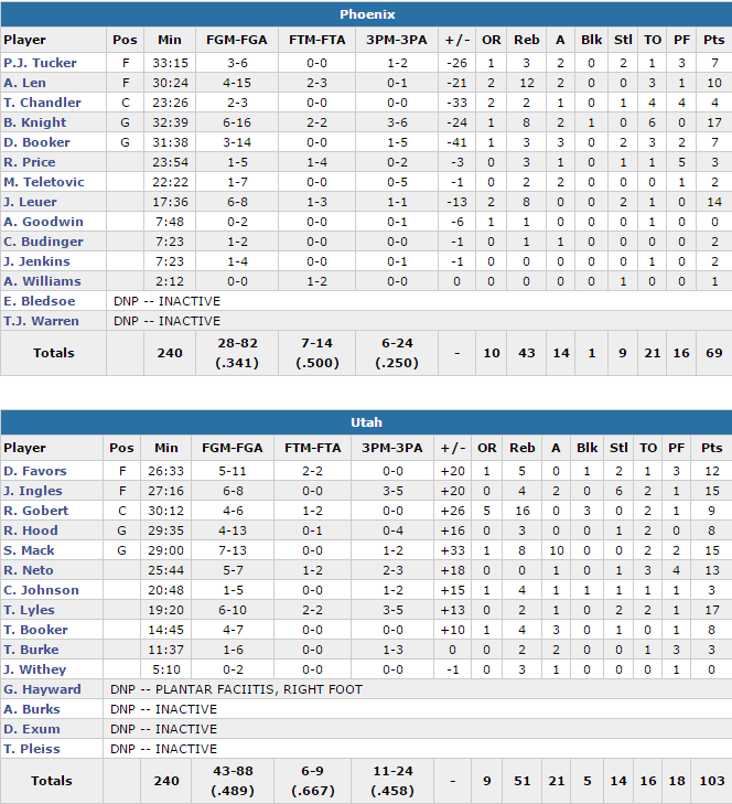 Sans Gordon Hayward Utah a une nouvelle fois fait parler son collectif et sa défense, qui a limité Phoenix à 34.1% et 21 ballons perdus. Trey Lyles signe 17 points, Shelvin Mack 15 points, 10 passes, Joe Ingles 15 points et Rudy Gobert, 9 points, 16 rebonds et 3 contres. La défense d’Utah est monté en puissance au fur et à mesure du match en limitant Phoenix à 17, 16 et 15 points dans les quarts 2 à 4.