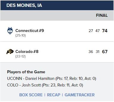 Commençons par les 5 choses à retenir : les Huskies d’UConn ont assuré face aux Buffaloes malgré une semaine dernière compliquée qui s’était terminée après 3 prolongations contre Cincinnati, Yale pourrait bien se faire une place dans le Sweet 16 après sa victoire sur Baylor, le matchup dont tout le monde rêvait (Indiana vs Kentucky) va bien avoir lieu au second tour puisque les Hoosiers et les Wildcats ont remporté leurs matchs respectifs, Little Rock a fait mentir nombre de brackets en battant Purdue et enfin, Wichita State a impressionné lors de sa victoire sur Arizona.