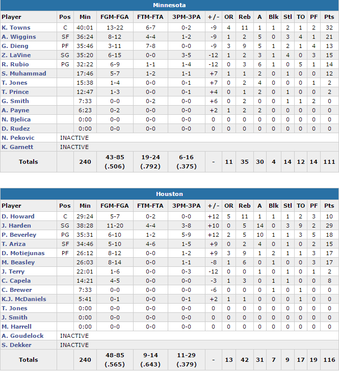 A la pause Houston était devant de 2 points grâce à un 4/6 derrière l’arc de Beverley.Le match a basculé en faveur des Rockets dans le 3ème avec une série durant laquelle le public s’est enflammé sur des dunks d’Howard et Ariza pour prendre 9 points d’avance. C’est avec 10 oints d’avance que Houston a entamé les 12 dernières minutes et a résisté au retour des jeunes loups dans la dernière minute sur un 8-0 grâce à deux trois points de LaVine.