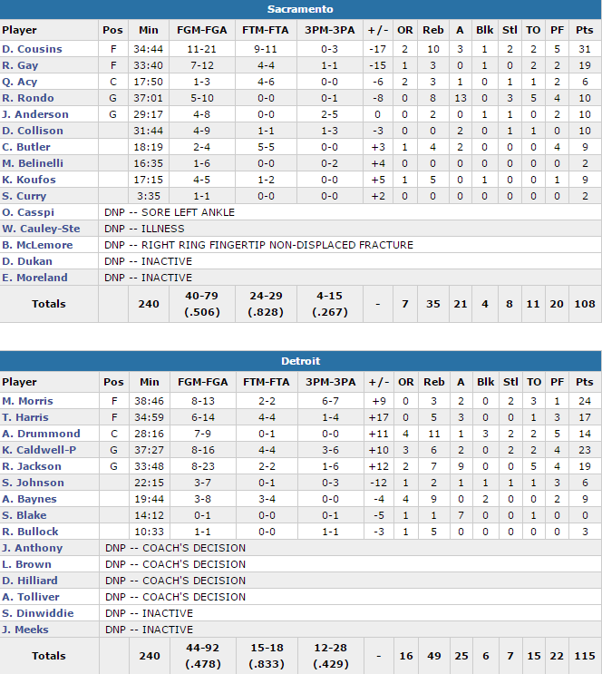 Detroit a démarré très fort grâce à son adresse pour faire exploser la défense des Kings, 24-10 puis 39-25 après 12 minutes. Detroit a ainsi battu son record de la saison de points en 1er quart et en 1ère mi-temps, mais les Kings sont revenus après la pause. A l’entame du dernier acte ils n’étaient plus qu’à 4 points et même 1 grâce à Cousins et Gay, mais Detroit n’a pas craqué et sur 2 trois points de Caldwell-Pope le score est passé à 107-98 à 3’21 de la fin, scellant le sort de la rencontre.
