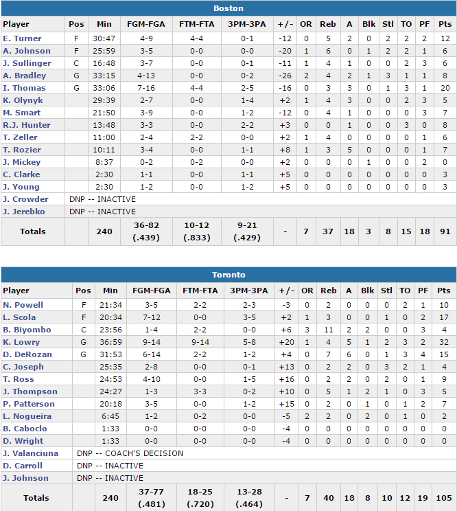Toronto a très vite fait le break en démarrant par une démonstration en premier acte. Ils ont mené 10-2 et limité Boston à 14 points pour un score de 30-14 après un quart. Boston a bien réagi offensivement dans le second dans le sillage de Zeller, Smart et Hunter mais à la pause le déficit était de 14 points, 55-41 avec une défense en difficulté. Au retour des vestiaires Boston a tenté un comeback et grappillé quelques points mais sans jamais revenir à moins de 2 possessions. A seulement 5 points çà l’entame du dernier acte, ils ont explosé en encaissant d’entré un 14-2 et en ne marquant que 2 points en 7 minutes.