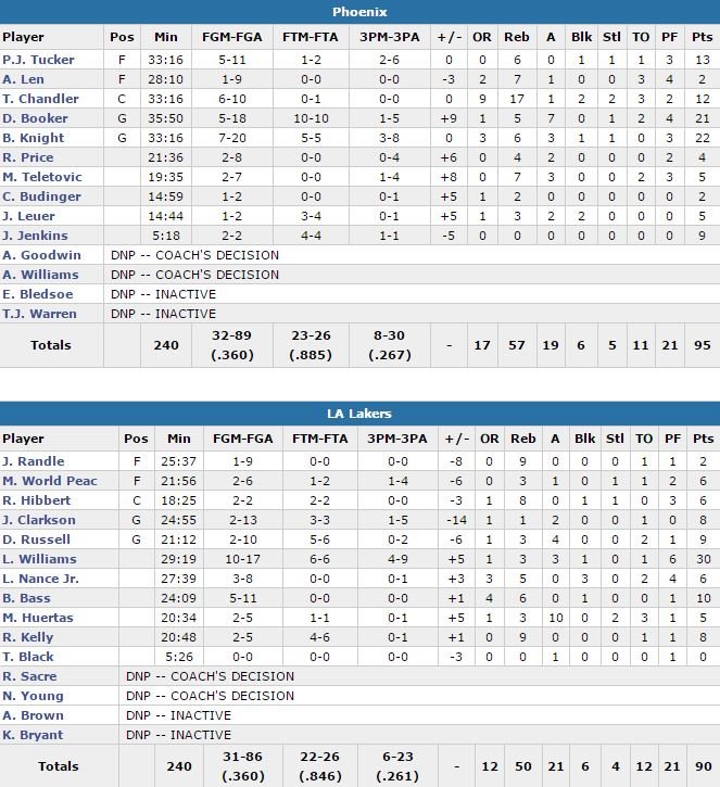 En l’absence de Kobe Bryant (épaule), Lou Williams a scoré 30 points en sortie de banc. Depuis leur victoire 97-77 le 3 janvier face aux Suns (ils étaient alors sur leur meilleure série de la saison avec 3 victoires), les Lakers ont un bilan de 6-27. Les Suns sont devant 47-32 à la mi-temps suite à un 18-4 bouclé par un layup de Jon leuer à 3’52 de la fin du deuxième quart-temps. Los Angeles manque 10 de ses 11 premiers shoots et est à 27.3% de réussite sur la première mi-temps (2/12 à 3-points). Julius Randle termine à 2 points à 1/9 en 26 minutes.