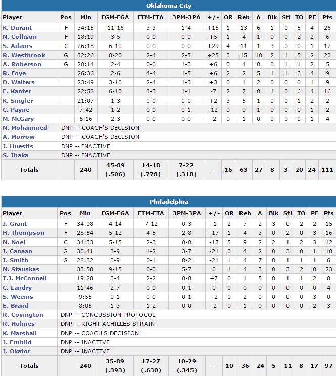 Westbrook a signé son 13ème triple-double de la saison, un record égalé sur les 25 dernières saisons (Grant Hill en 1996-97 et Jason Kidd en 2007-08). Il termine avec 20 points, 15 rebonds et 10 passes alors que Kevin Durant ajoute 26 points à 11/16, 13 rebonds et 6 passes. Enes Kanter marque lui 16 points en sortie de banc et OKC termine avec 50.6% aux tirs tout en limitant les Sixers à seulement 39.3%. Nik Stauskas sauve les meubles avec 23 points et Hollis Thompson 16. Philly a été dominé 63-36 aux rebond.