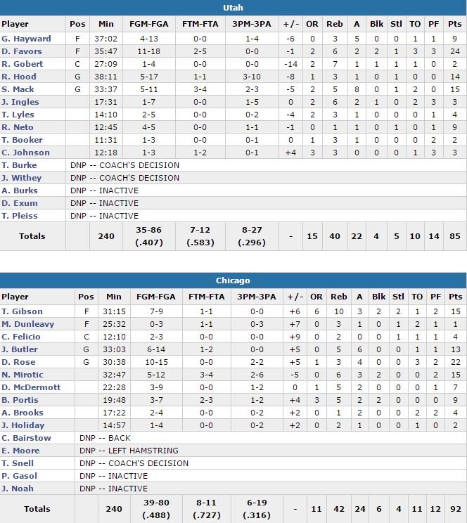 Rose plante 16 points en 1ère mi-temps à 7/10 aux tirs (15 minutes de jeu) et c’est assez pour donner 10 points d’avance à Chicago à la pause, 50-40. Utah revient à 58-52 dans le 3ème quart mais les Bulls répondent par un 14-5 et le score passe à 72-57 en leur faveur. Avant de jouer les 12 dernières minutes, ils comptent 12 points d’avance, 79-67. À 87-73 en milieu de 4ème quart-temps, ils doivent néanmoins faire face à un 10-2 de la part du Jazz mais ont su tenir jusqu’au bout grâce à leur avance précédemment acquise et malgré un dernier quart perdu 18-13.
