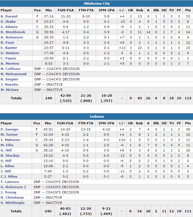 Le meneur signe 14 points à un très mauvais 4/17 en plus de 11 rebonds et 14 passes. Mais l’homme du match pour OKC c’est Kevin Durant, auteur de 33 points à 11/20, 13 rebonds et 8 passes. OKC shoote à 52.5% sur la rencontre avec 15 points et 10 rebonds pour Enes Kanter et 12 points pour Randy Foye. En face Paul George a tout tenté avec 45 points à 14/29 dont 4/10 à trois points, mais l’aide de George Hill n’a pas suffi (20 points et 9 passes). Ils ont souffert en défense et n’ont pas su limiter l’attaque du Thunder.