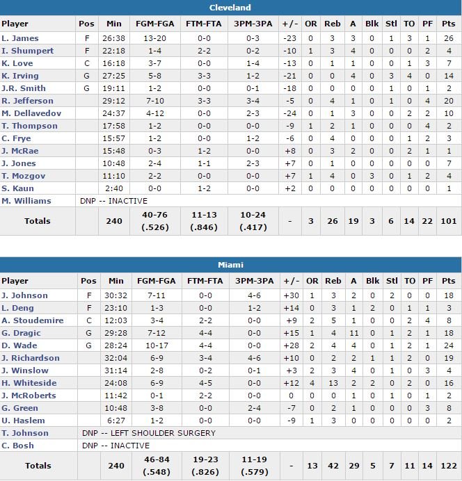 Wade termine à 24 points (10/17, 4 rebonds et 4 passes), accompagné au scoring par les 19 points de son rookie Josh Richardson dans un match mené de bout en bout par le Heat. Goran Dragic signe lui 18 points et 11 passes, Joe Johnson ajoute 18 points et Hassan Whiteside est en double-double avec 16 points et 13 rebonds (Miami a dominé Cleveland 42-26 au rebond). Le sort du match déjà décidé, LeBron James n’a lui même pas disputé les 15 dernières minutes du match mais termine tout de même à 26 points (13/20, 3 rebonds et 3 passes). Richard Jefferson suit avec 20 unités alors que Kyrie Irving marque lui 14 points à 5/8 et distribue 4 passes en 27 minutes de jeu.