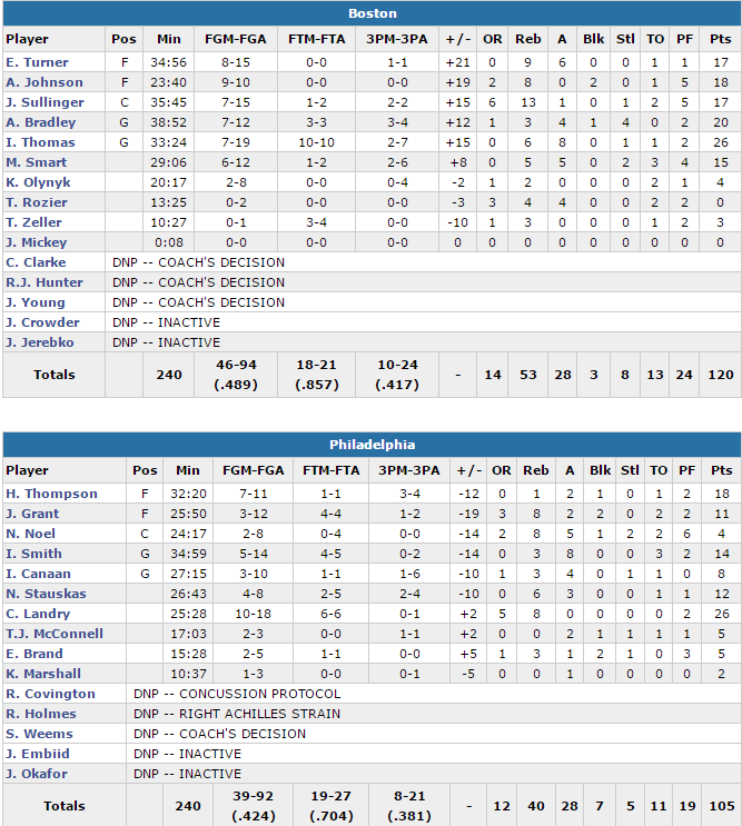 Les Sixers ont mal commencé la rencontre en ratant 17 shoots de suite dans le premier quart pour une avance de 28-16 de Boston. Ils ont ensuite couru après le score tout le match et réussi à revenir plusieurs fois à 6 points dans le 3ème. T.J. McConnell avait justement mis les siens à 6 points à 2.4 secondes de la fin du quart mais Thomas a marqué un shoot très longue distance au buzzer, 88-79. Pas suffisant pour se débarrasser définitivement des locaux, qui ont fait un retour à 4 points sous l’impulsion de Landry. Mais ils n’ont jamais pu revenir plus près et la fin de rencontre a été à l’avantage de Boston qui a repris ses aises grâce à son adresse et bien aidé par les 5 fautes de Nerlens Noel.