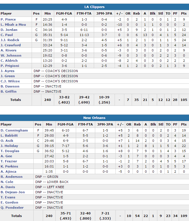 Jrue Joliday a mené l’équipe avec 22 points à 7/17 et 8 passes mais c’est le collectif qui a fait la différence, chaque joueur apportant sa pierre à l’édifice. Omer Asik ajoute 15 points et 14 rebonds, Dante Cunningham 19 points, Tim Frazier 17 points, Toney Douglas 15 points, 7 rebonds et 9 passes. Les Pelicans ont montré une belle circulation du ballon et ils ont été récompensés avec 49.3% de leurs shoots réussis. En face les Clippers n’ont pas été autant en réussite avec 40.2% dont un 10/39 derrière l’arc et 13 lancers francs manqués. Chris Paul signe 24 points à 5/14 et 13 passes alors que JJ Redick inscrit lui aussi 24 points mais à 9/11 dont 4/5 à trois points.