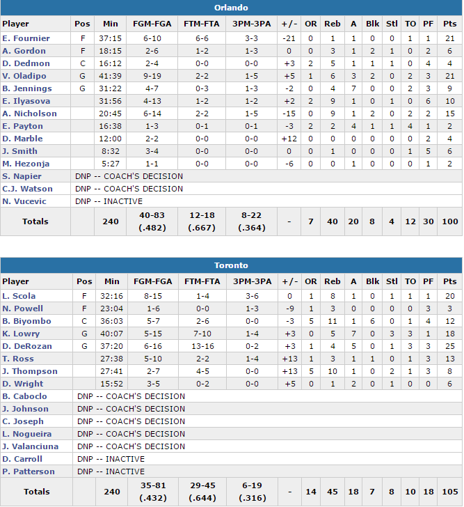 Après un départ canon pour mener 10-2, Toronto a laissé petit à petit les Floridiens revenir et passer devant sur un 13-2 en milieu de second quart. A la pause Orlando menait 55-52 grâce à son duo Fournier-Oladipo. Jennings et Oladipo ont même porté cette avance à 8 points mais sans jamais pouvoir distancer Toronto, qui est resté à portée de tir. A 8 minutes de la fin de la rencontre Orlando était toujours bien placé, menant 91-85. Maladroit, Orlando a vu les Canadiens leur fondre dessus et faire le break sans pouvoir réagir avec un 10-0, 95-91. Evan Fournier a permis au Magic de s’accrocher avec notamment un trois points mais cette maladresse collective a finalement coûté le match aux hommes de Scott Skiles. DeRozan sur un panier plus la faute et Ross sur la ligne des lancers ont plié le match.