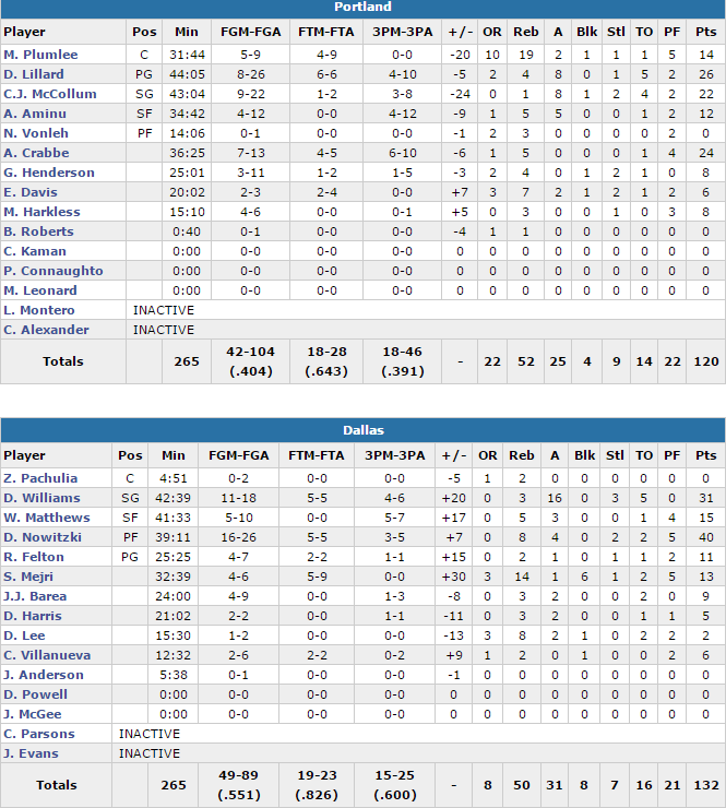 Il est le plus vieux joueur à inscrire 40 points depuis Karl Malone en novembre 2003. Il signe exactement 40 points à 16/26 dont 3/5 à trois points, 8 rebonds et 4 passes en 39 minutes. Il a été parfaitement aidé par Deron Williams, auteur lui de 31 points à 11/18 et 4/6 à trois points en plus de 16 passes et 3 interceptions. Wesley Matthews a ajouté 15 points à 5/7 derrière l’arc et le pivot remplaçant Salah Mejri a fait du bon boulot avec 13 points, 14 rebonds et 6 contres. Les Mavs ont shooté à 55.1% contre seulement 40.4 aux Blazers, mais ces derniers ont capté pas moins de 22 rebonds offensifs dont 10 pour le seul Mason Plumlee. Damian Lillard et CJ McCollum ont connu une soirée compliquée en attaque avec 26 points à 8/26 pour Lillard et 22 points à 9/22 pour McCallum et les deux distribuent 8 passes décisives. Allen Crabbe a été très précieux en sortie de banc avec 24 points à 6/10 derrière l’arc.