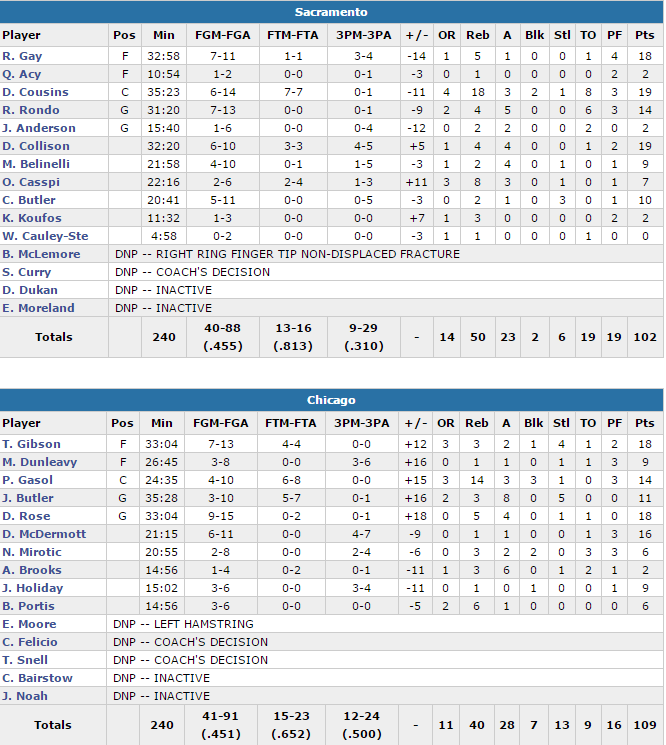 Derrick Rose et Taj Gibson ont marqué 18 points, Doug McDermott en ajoute 16 et Pau Gasol compile 14 points et 14 rebonds (il faisait son retour) pour permettre aux Bulls de réaliser un comeback victorieux. Rose a shooté à 9/15 et a rentré 2 shoots très importants dans le 10-0 décisif du dernier quart pour remonter 5 points de retard. Chicago a rentré 12 de ses 24 tentatives de loin alors que les Kings perdent 19 ballons. DeMarcus Cousins compile 19 points à 6/14 et 18 rebonds mais perd 8 ballons et Rajon Rondo 6. Darren Collison inscrit 19 points et Rudy Gay 18.