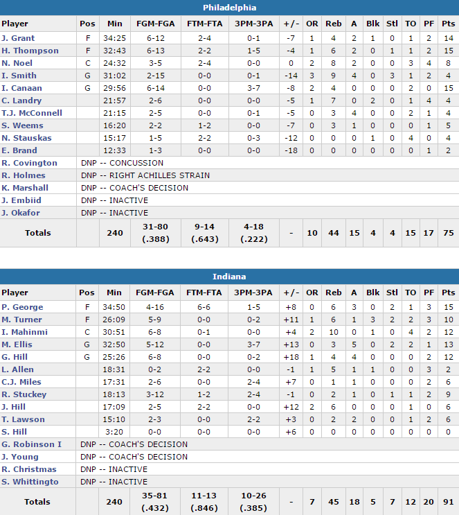 A 7’06 de la fin du 3ème acte Canaan a mis Philadelphie à 2 points, 55-53 mais Indiana a marqué les 8 points suivants et s’est envolé dans le dernier acte.